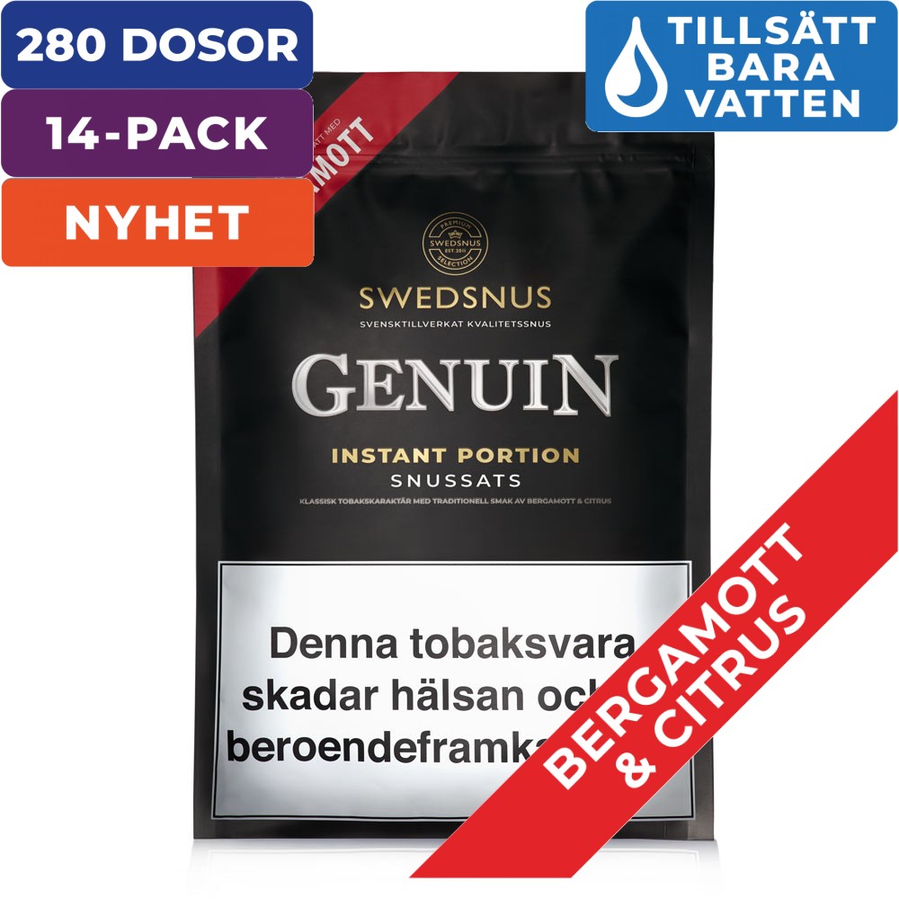 Swedsnus Genuin Instant Portion 400 är traditionellt smaksatt med Bergamott och Citrus och innehåller ca 400 ofuktade standardprillor med äkta svenskt pastöriserat snus som ger snabb och tydlig nikotinleverans efter fuktning. Snuset är gjort på en välbalanserad och fyllig tobaksblandning av allra högsta kvalitet med tydlig klassisk tobakskaraktär och mjuk avrundning.