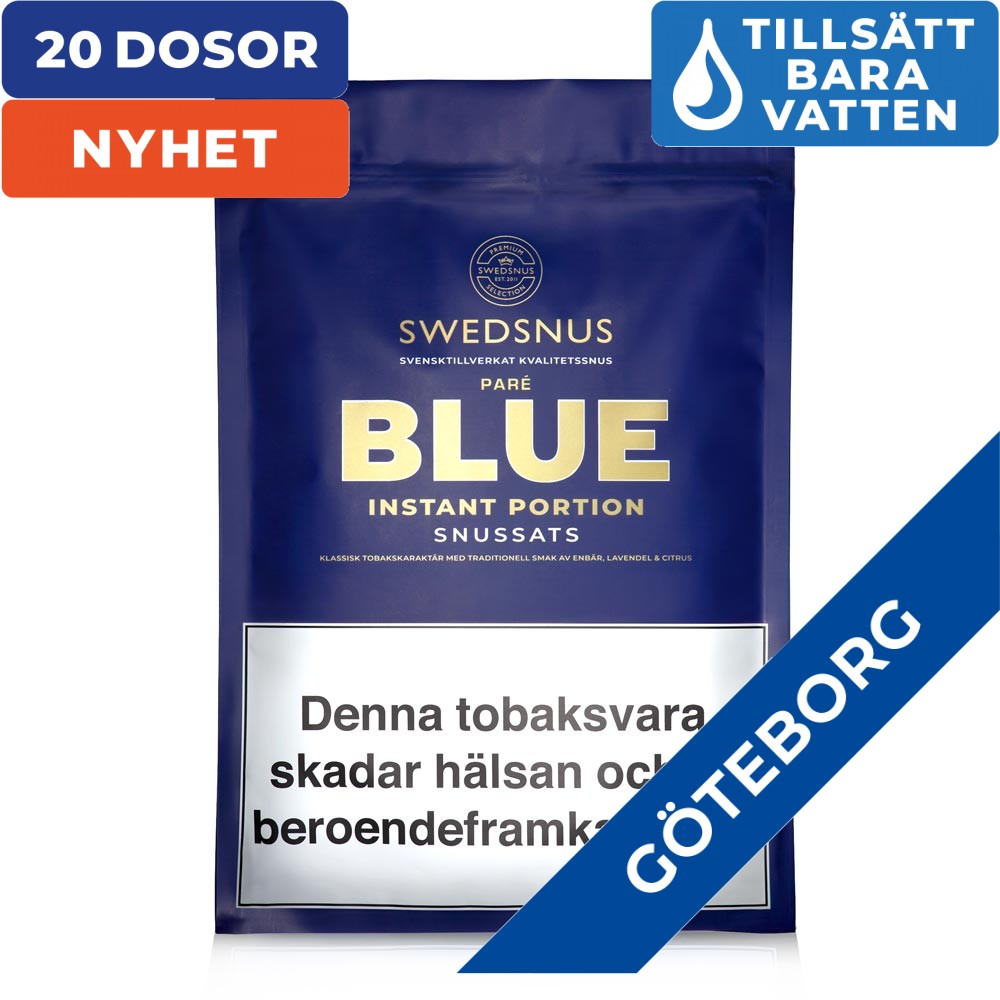 Swedsnus Paré Blue Instant Portion 400 - Klassisk och traditionell smaksättning ifrån Göteborg med en välbalanserad och aromatiskt kombination av enbär, lavendel och en lätt ton av citrus för friskhet. Innehåller ca 400 ofuktade standardprillor med äkta svenskt pastöriserat snus som ger snabb och tydlig nikotinleverans efter fuktning. Snuset är gjort på en välbalanserad och fyllig tobaksblandning av allra högsta kvalitet med tydlig klassisk tobakskaraktär och mjuk avrundning. Paré Blue Instant Portion lämpar sig väl för den som vill bestämma fukthalt på sin prilla själv genom att bara tillsätta rent vatten.