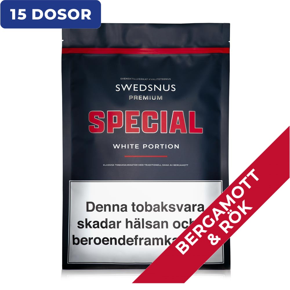Färdig att snus direkt. Klassisk snussmaksättning med bergamott och en lätt ton av rök i väl avvägd balans med utvald premiumtobak. Smaksättningar med milda citrustoner från bergamott har varit given på den svenska snusmarknaden ända sedan 1800-talet och är det än idag. Swedsnus Special Portionssnus produceras i små partier och utan några onödiga eller onaturliga tillsatser i vår egen fabrik