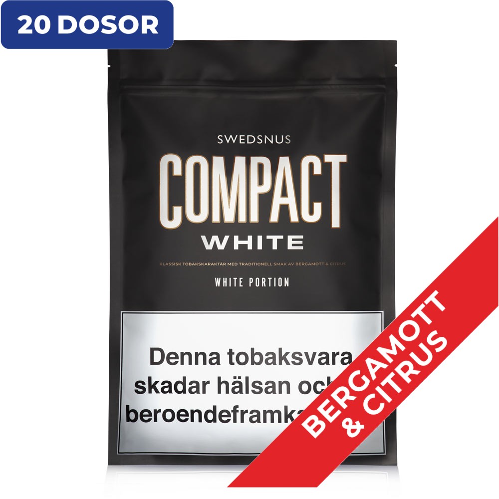 White Compact - Kompakta portioner i lite smalare normalformat. Traditionell smaksättning med Bergamott och Citrus i välbalanserad kombination med snus av klassisk tobakskaraktär. Våra whiteportioner är gjorda av tobak av allra högsta kvalitet och tillverkningen sker enligt svensk hantverkstradition i vår egen fabrik.